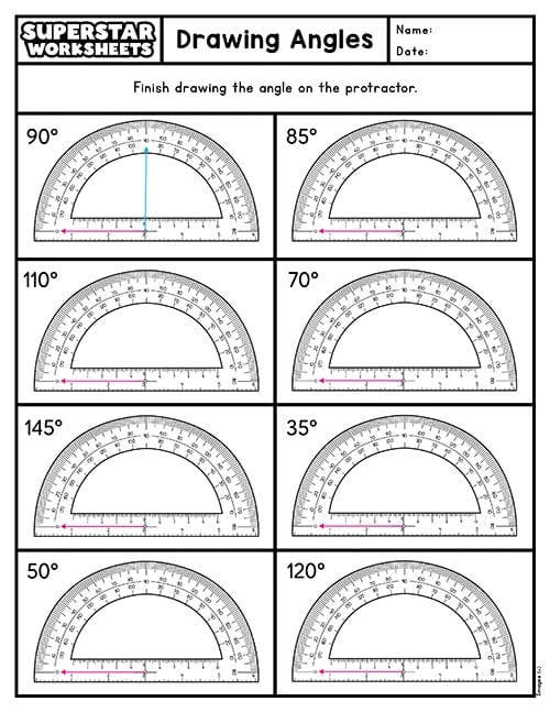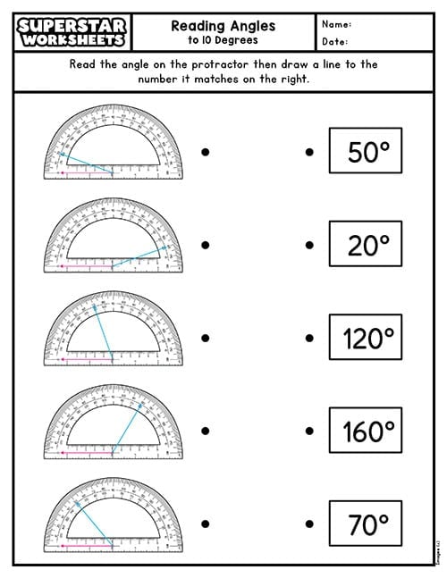 This printable protractor worksheet has students read angles in 10-degree increments on the protractor printable and draw lines to match each measurement, building foundational skills with this free printable protractor practice tool. For more FREE measurement tools take a look at our Kindergarten Measurement Worksheets!