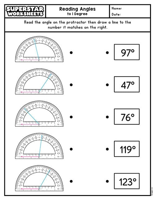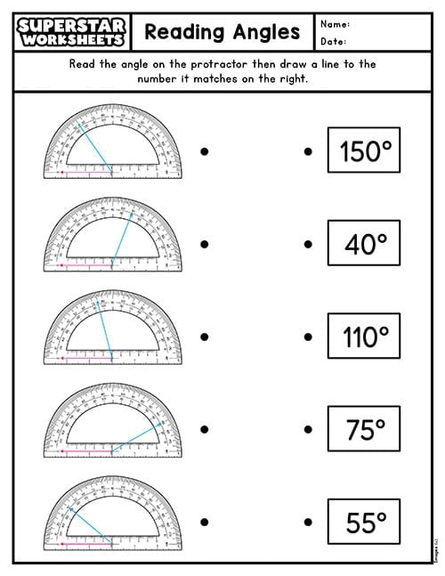 This printable protractor worksheet has students read angles on each protractor printable and draw lines to match measurements in 5-degree increments, providing essential practice with this free printable protractor matching activity. Teachers! If you need more FREE math printables please take a look at our selection of Math Worksheets!