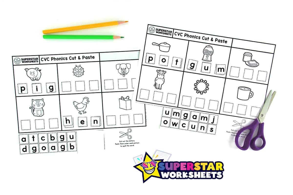 Free, fun, and student-friendly CVC cut and paste worksheets for kindergarten provide early literacy skill support.