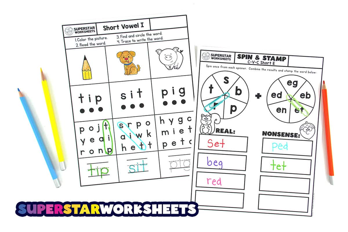 Fun and engaging spin and stamp CVC worksheets make kindergarteners love to read.