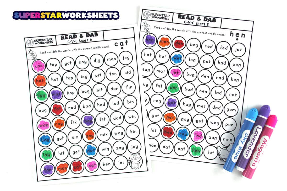 With these read and dab phonics printable worksheets, students will dab to cover each CVC word.