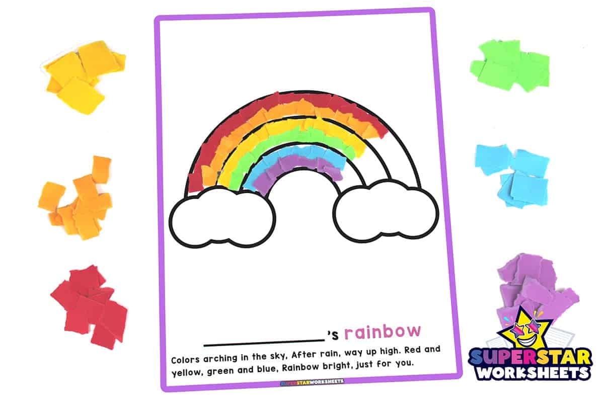 Here is a three striped rainbow torn paper craft for children to fill up. This craft will help teach young students their colors. Don’t miss our rainbow templates for more colorful fun!