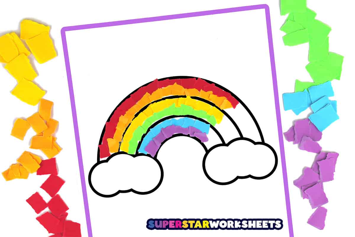 Here is a three striped rainbow torn paper craft for children to fill up. This craft will help teach young students their colors. Don’t miss our rainbow templates for more colorful fun!