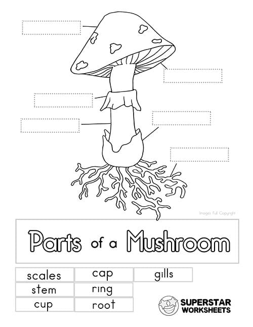 Label all 7 parts of a mushroom with this handy worksheet. Your student will identify scales, cap, stem, ring, cup, root and gills. Grab some scissors, glue, and simply paste the labels.