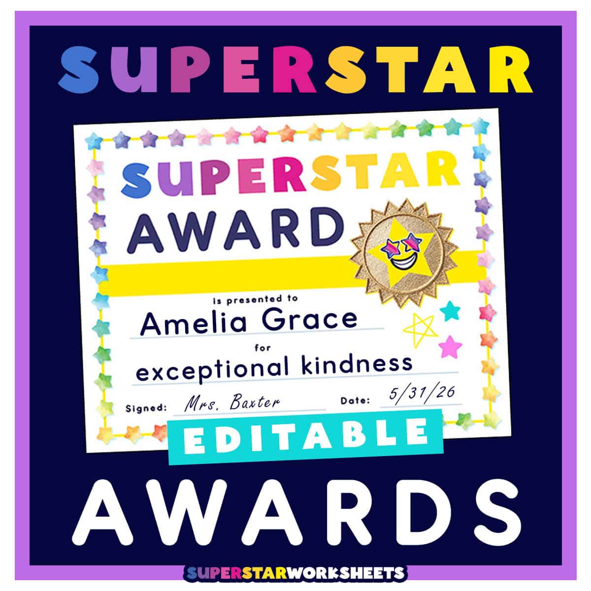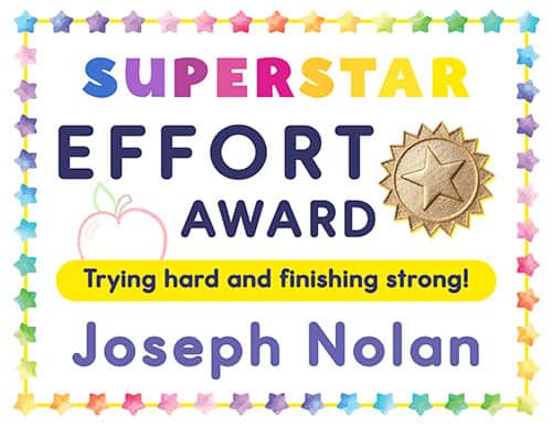 FREE Superstar Awards! These free printable certificates and awards, in pdf format, are perfect for celebrating student success in your classroom or homeschool. They’re completely editable so you can add your own students’ names, dates, and specific achievements. Our vibrant printable awards recognize achievements in academic excellence, as well as character strengths such as teamwork, effort, and positive behavior. Download these free printable award certificates today!