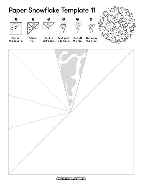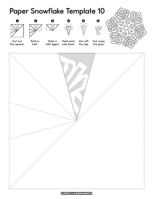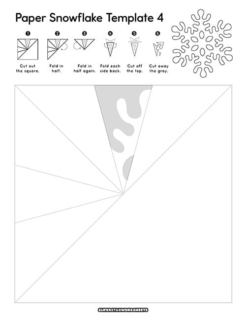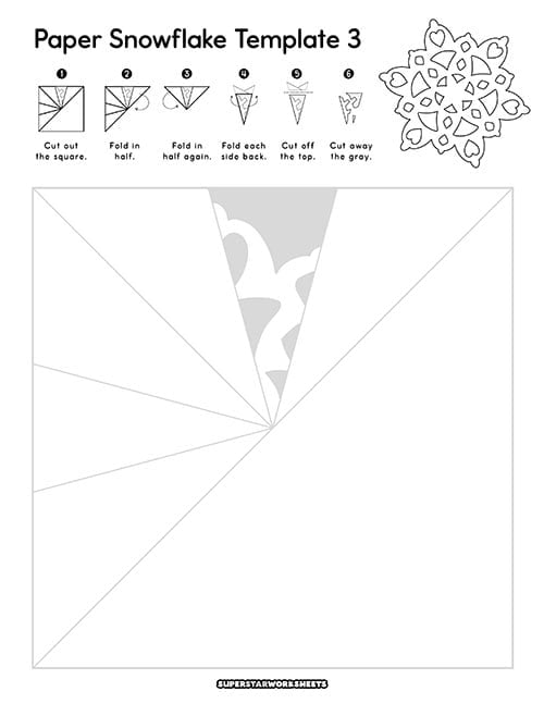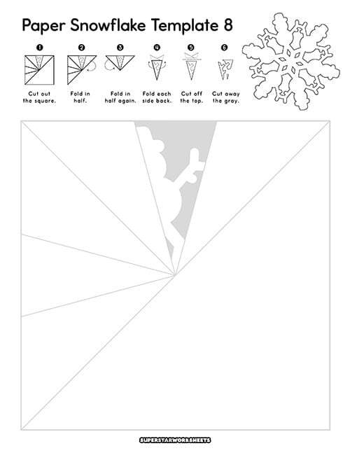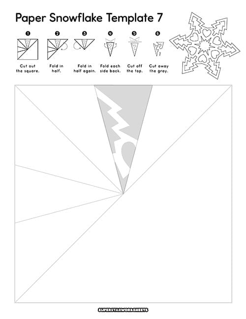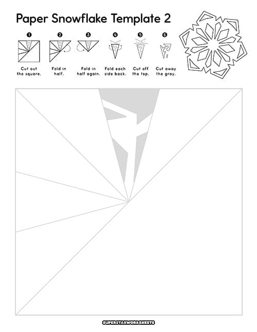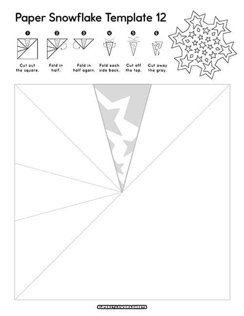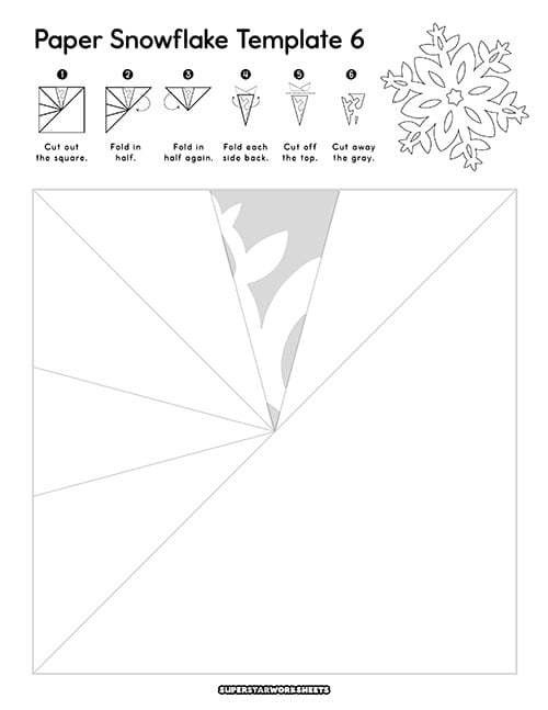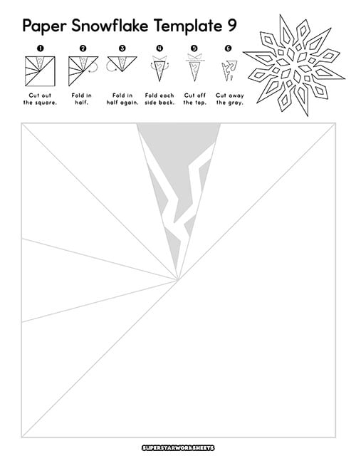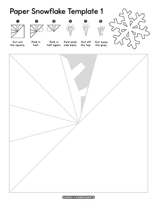 Simple, downloadable snowflake cut out pattern for students to recreate this easy paper snowflake. Students first need to cut out the surrounding square, then fold along the grey lines. Next, instruct students to cut out the grey areas. Once unfolded they’ll have a pretty paper snowflakeTeach students that while snowflakes are amazing and intricate, they are also easy to recreate with our DIY Snowflake templates.