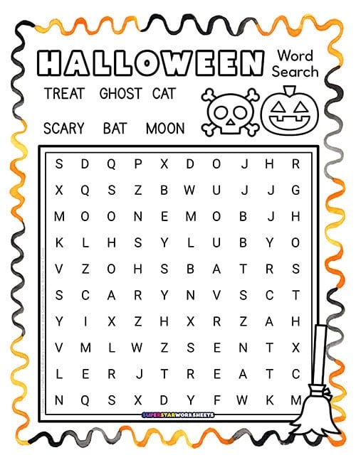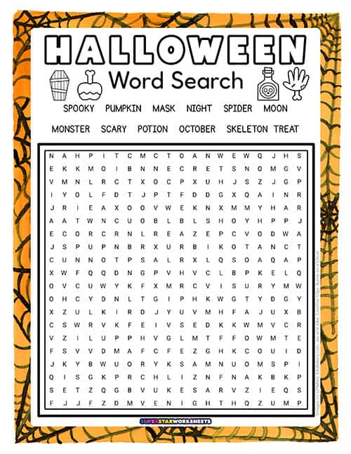 Word List: bat, black, broom, candy, cat, cauldron, costume, creepy, ghost, goblin, haunted, Halloween, magic, mask, monster, moon, night, October, potion, pumpkin, scary, skeleton, spider, spooky, treat, trick, vampire, web, witch, zombie.