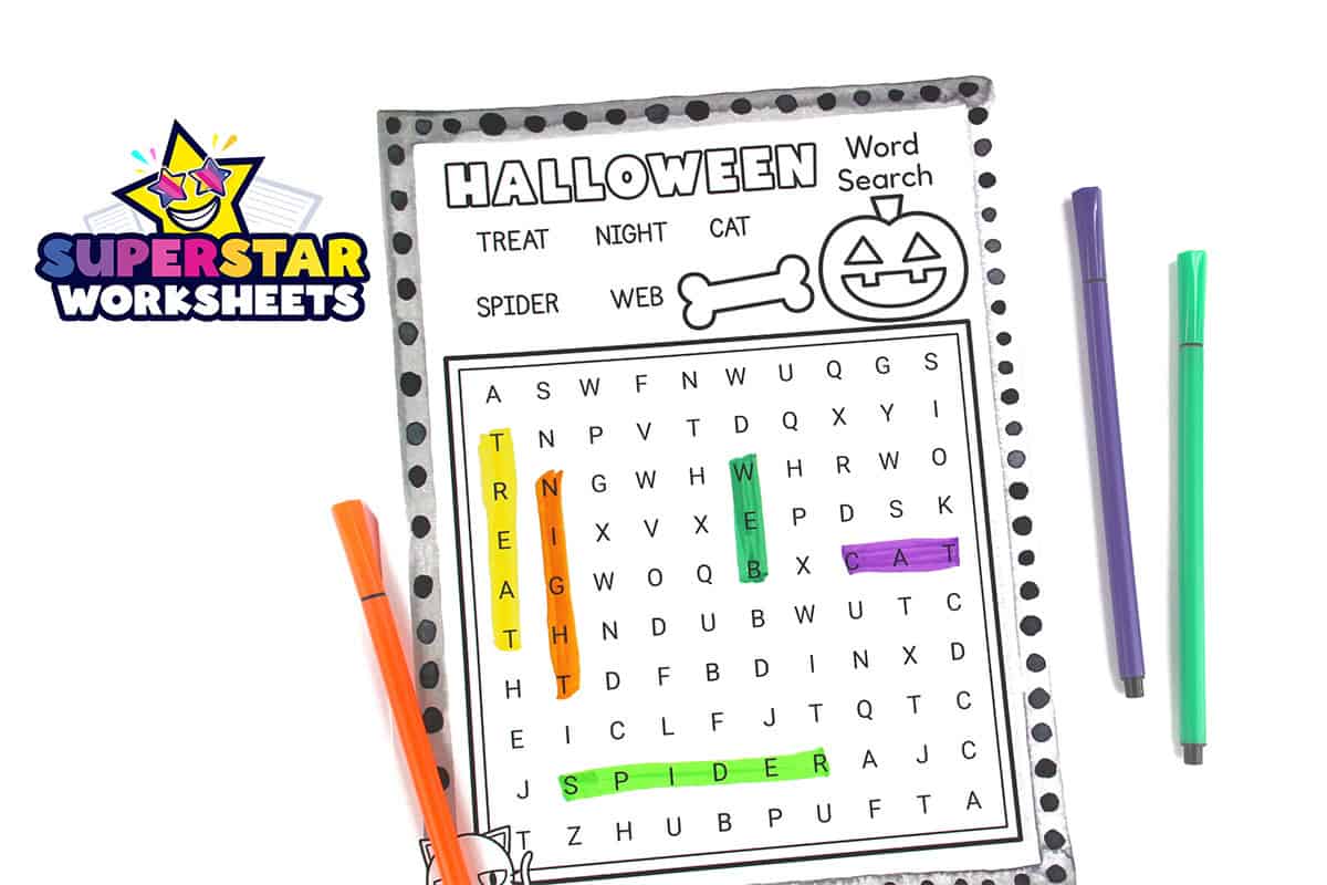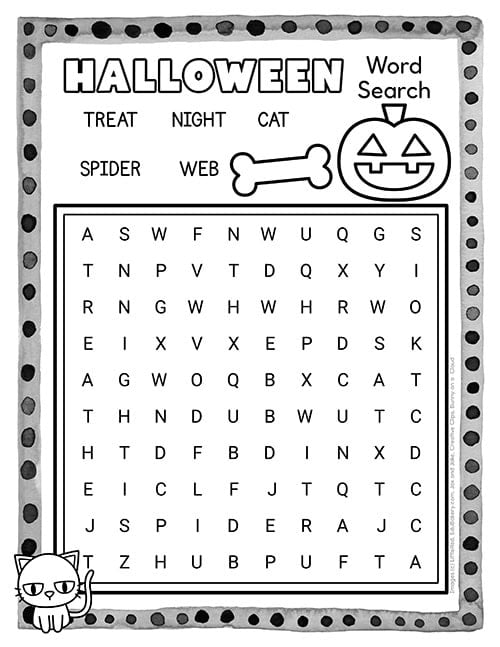 This easy word search Halloween puzzle has only 5 simple words (treat, night, cat, spider, web) in a smaller grid – perfect for kindergarten or first grade students just learning how word searches work.