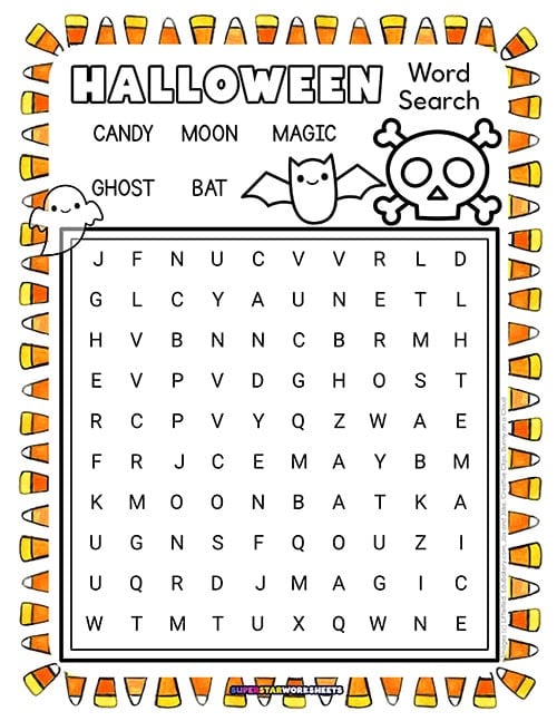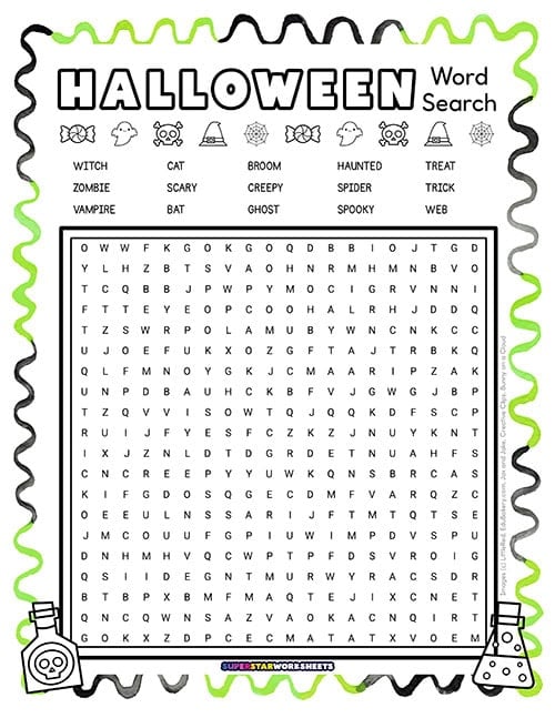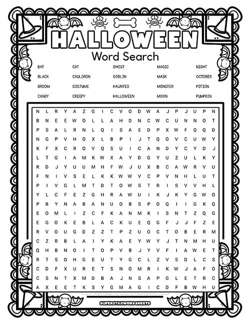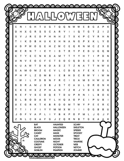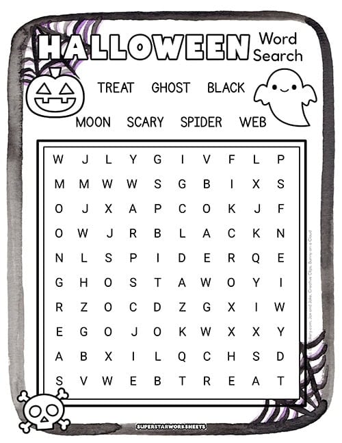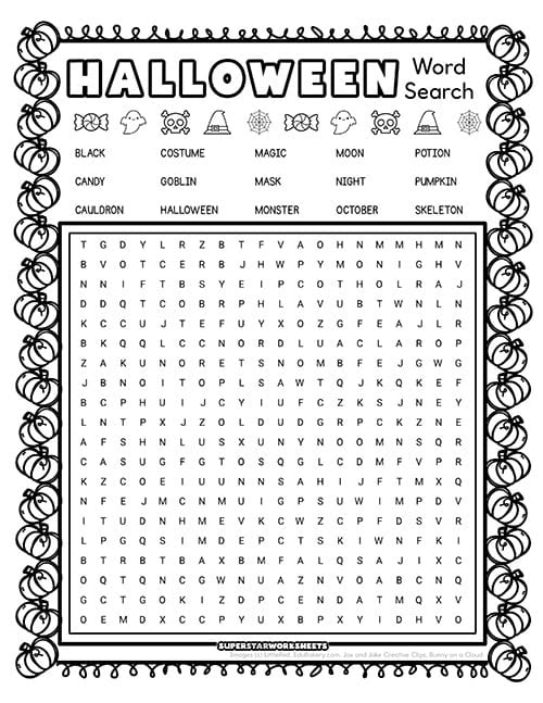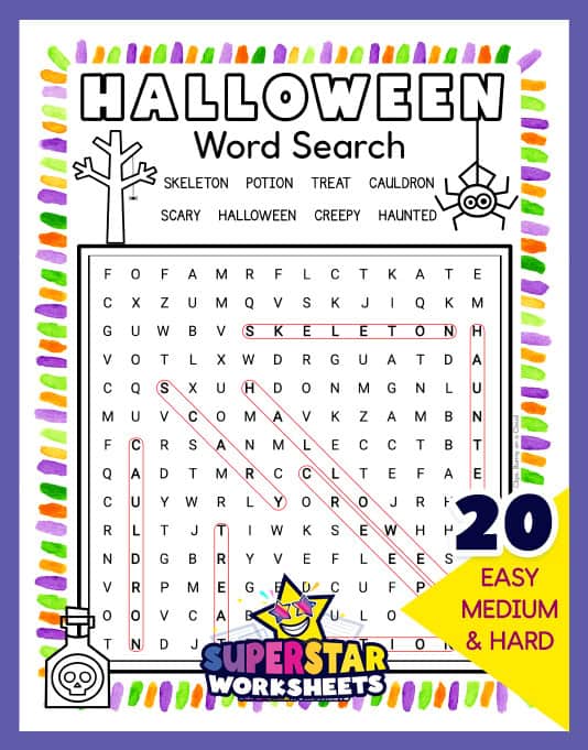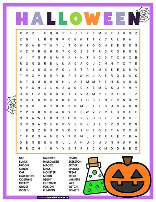 This Halloween word search includes 30 Halloween-themed words in a colorful grid with jack-o’-lantern graphics. Kids can work independently or race against classmates to find all the hidden words.