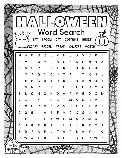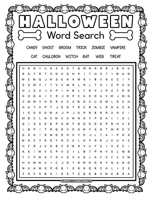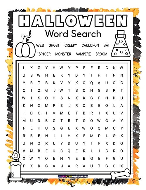 Word List: spider, vampire, bat, cat, ghost, spooky, web, black, cauldron, goblin, treat, witch, broom, costume, haunted, trick, zombie, candy, creepy, Halloween.
