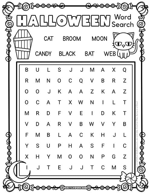 Students strengthen spelling awareness as they locate words like spooky, mask, night, and moon. These puzzles require no prep time – just download, print, and distribute.