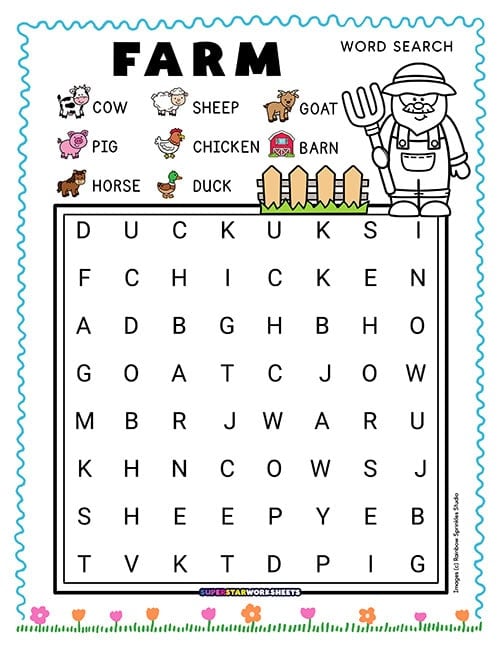 Free printable kindergarten word search featuring farm animals and barn vocabulary. This easy word search puzzle for kindergarten includes simple farm words perfect for beginning readers.