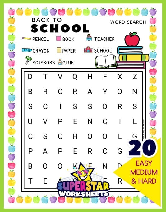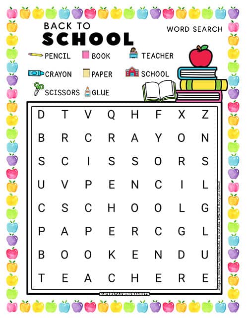 This kindergarten word search printable makes a great homework assignment or classroom activity for the start of the school year. Perfect for practicing school supply vocabulary in a fun way, this easy word search puzzle for kindergarten features a colorful back-to-school theme with apples and school supplies.