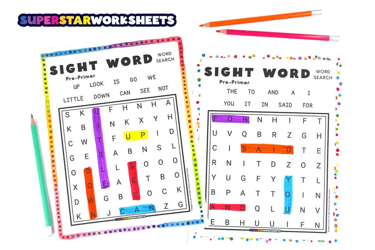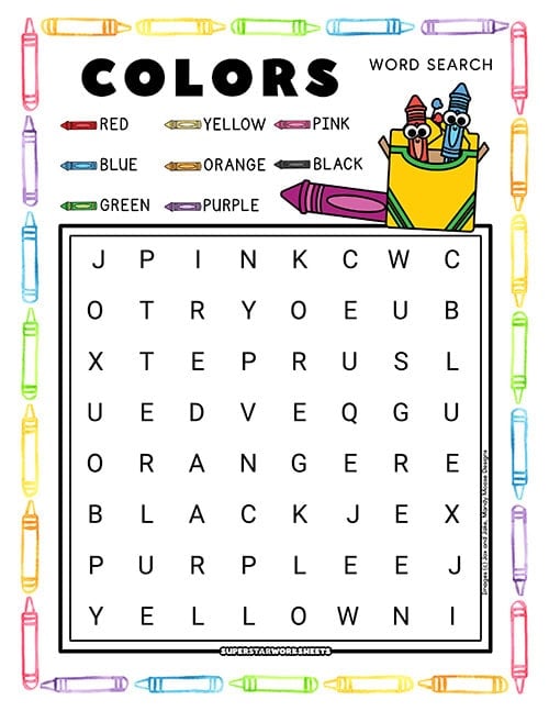This free printable kindergarten word search is perfect for early elementary students learning color words. The colorful crayon border makes this word search for kindergarten engaging and fun while helping young learners build letter recognition and reading skills.