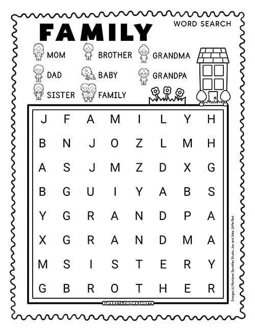 This kindergarten word search printable features family vocabulary perfect for young learners. This easy word search puzzle for kindergarten helps students practice letter recognition and reading skills while learning important family member words. Try our FREE Valentine’s Day Word Search.