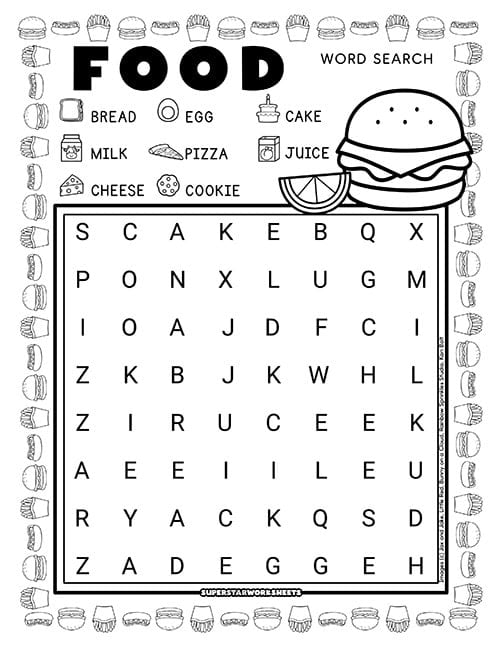 This printable word search for kindergarten features common food vocabulary with a fun hamburger and snack border. The black and white design makes this kindergarten word search printable budget-friendly while helping students build early literacy skills.