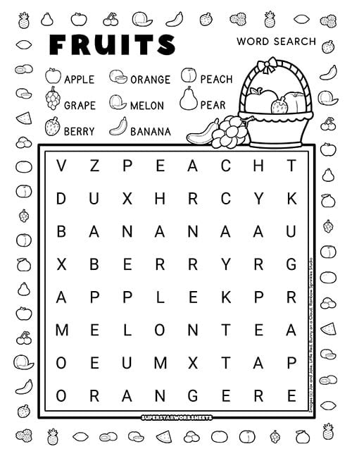 This kindergarten word search free printable features healthy fruit vocabulary with a fruit basket for students to color. Perfect for nutrition units or healthy eating lessons, this easy word search puzzle for kindergarten helps young learners practice letter recognition skills.