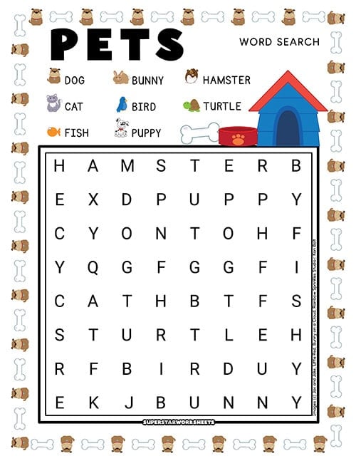 This kindergarten easy word search features popular pet vocabulary perfect for animal units or pet-themed lessons. The adorable dog house and bone border makes this word search for kindergarten engaging while helping young learners practice letter recognition and spelling skills.