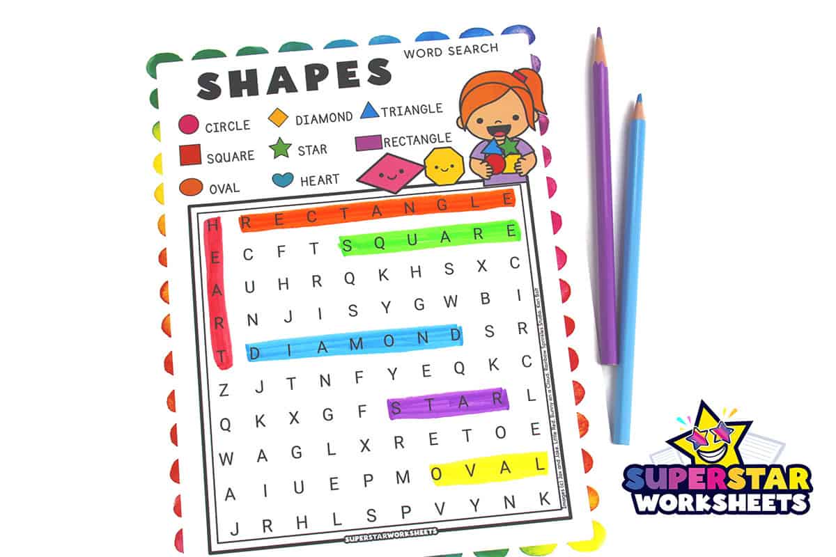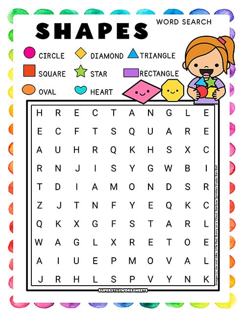 Word List: circle, diamond, triangle, square, star, rectangle, oval, heart.