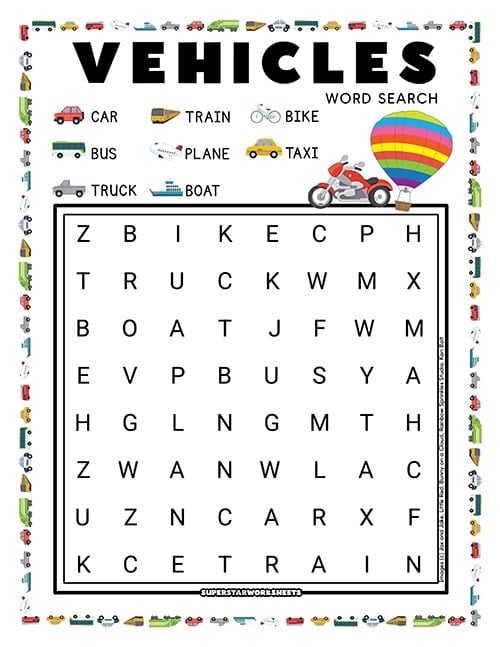 This kindergarten word search printable features fun transportation vocabulary perfect for young learners. The colorful vehicle border makes this easy word search puzzle for kindergarten engaging while helping students practice letter recognition and reading skills. For more directional based worksheets, try our printable Following Directions: Listening Skills Bundle here!