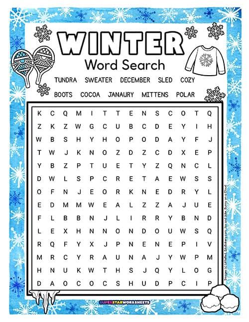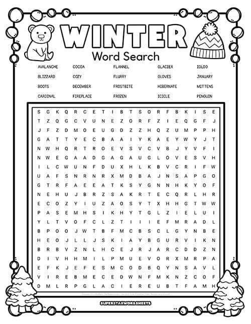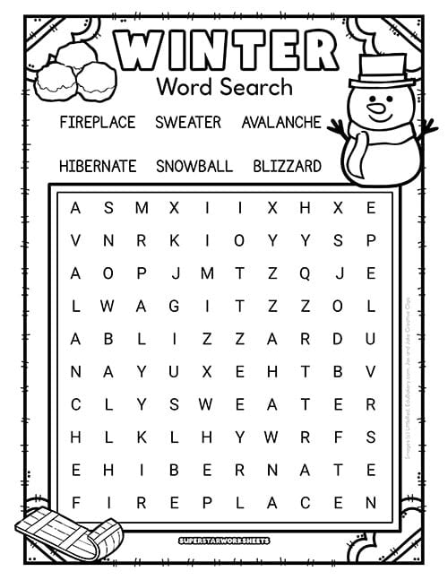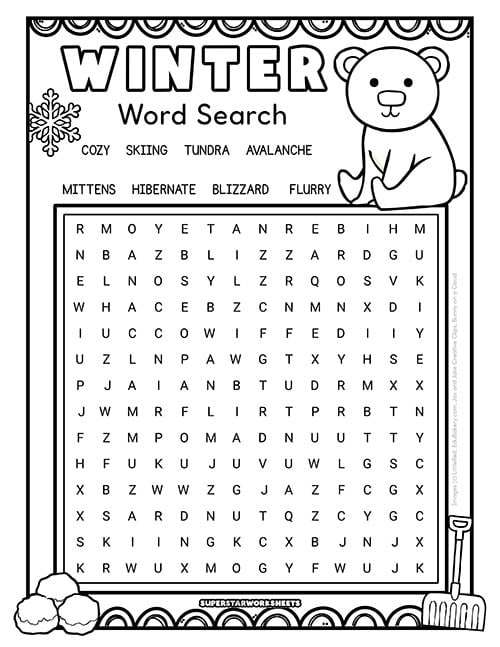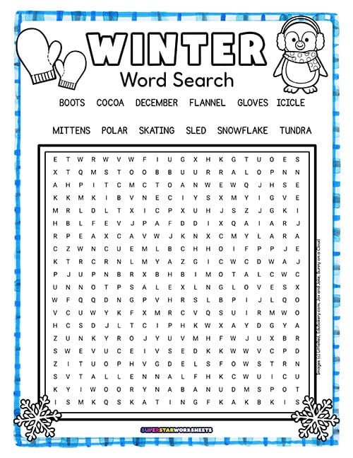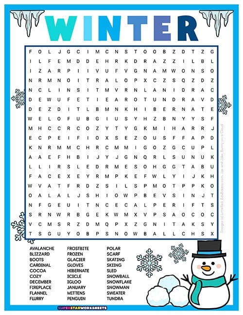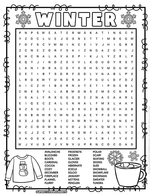 Word List: avalanche, blizzard, boots, cardinal, cocoa, cozy, December, fireplace, flannel, flurry, frostbite, frozen, glacier, gloves, hibernate, icicle, igloo, January, mittens, penguin, polar, scarf, skating, skiing, sled, snowball, snowflake, snowman, sweater, and tundra.