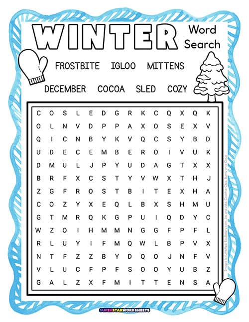 Allow students to escape into the winter season with this free winter word search puzzle. They will look for words like “tundra,” “mittens,” and “cocoa,” while also using their spelling skills to complete the puzzle.