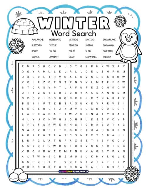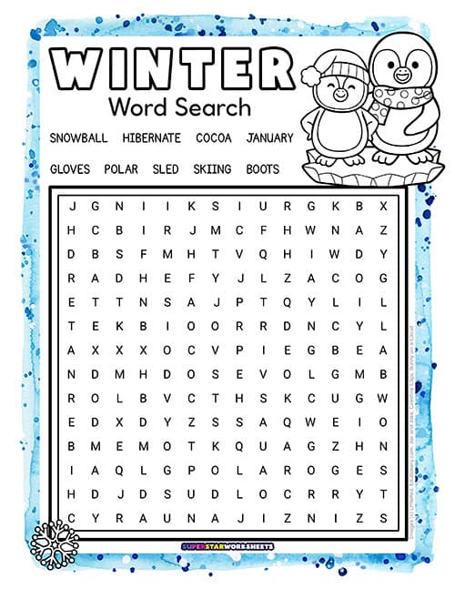 This intermediate-level winter word search puzzle features words related to the season’s cold. Students can find words like “sled,” “penguin,” and “fireplace,” helping them to embrace the winter season with this free winter word search printable!