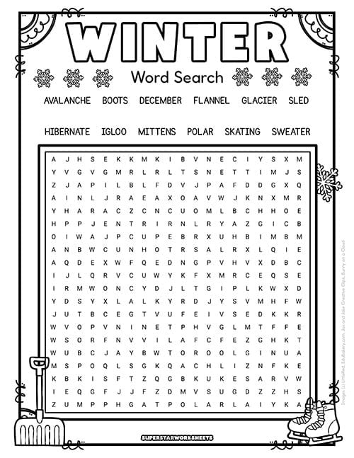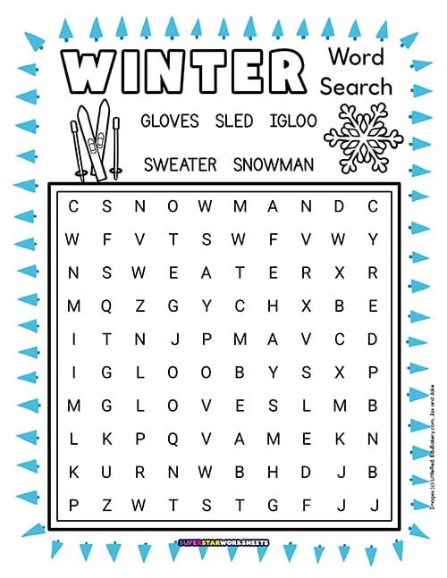 Keep students engaged throughout the winter months by incorporating this free printable winter word search puzzle. They will search for words like “snowball,” “hibernate,” and “boots,” all the while reinforcing spelling and winter vocabulary.