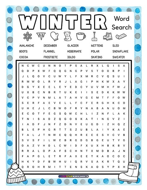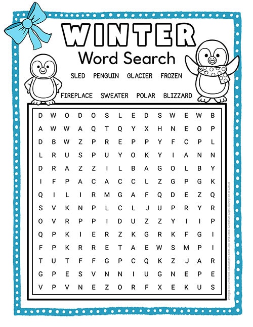 Free printable winter word search puzzle with 30 words to seek and find. Featuring adorable winter designs, this winter word search printable PDF is perfect for kids, teens, and adults. Includes answer key.