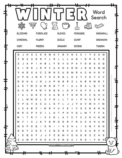 Word List: blizzard, fireplace, gloves, penguins, snowball, cardinal, flurry, icicle, scarf, snowman, cozy, frozen, January, skiing, and tundra.