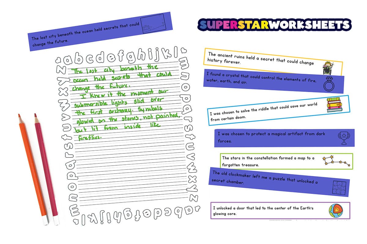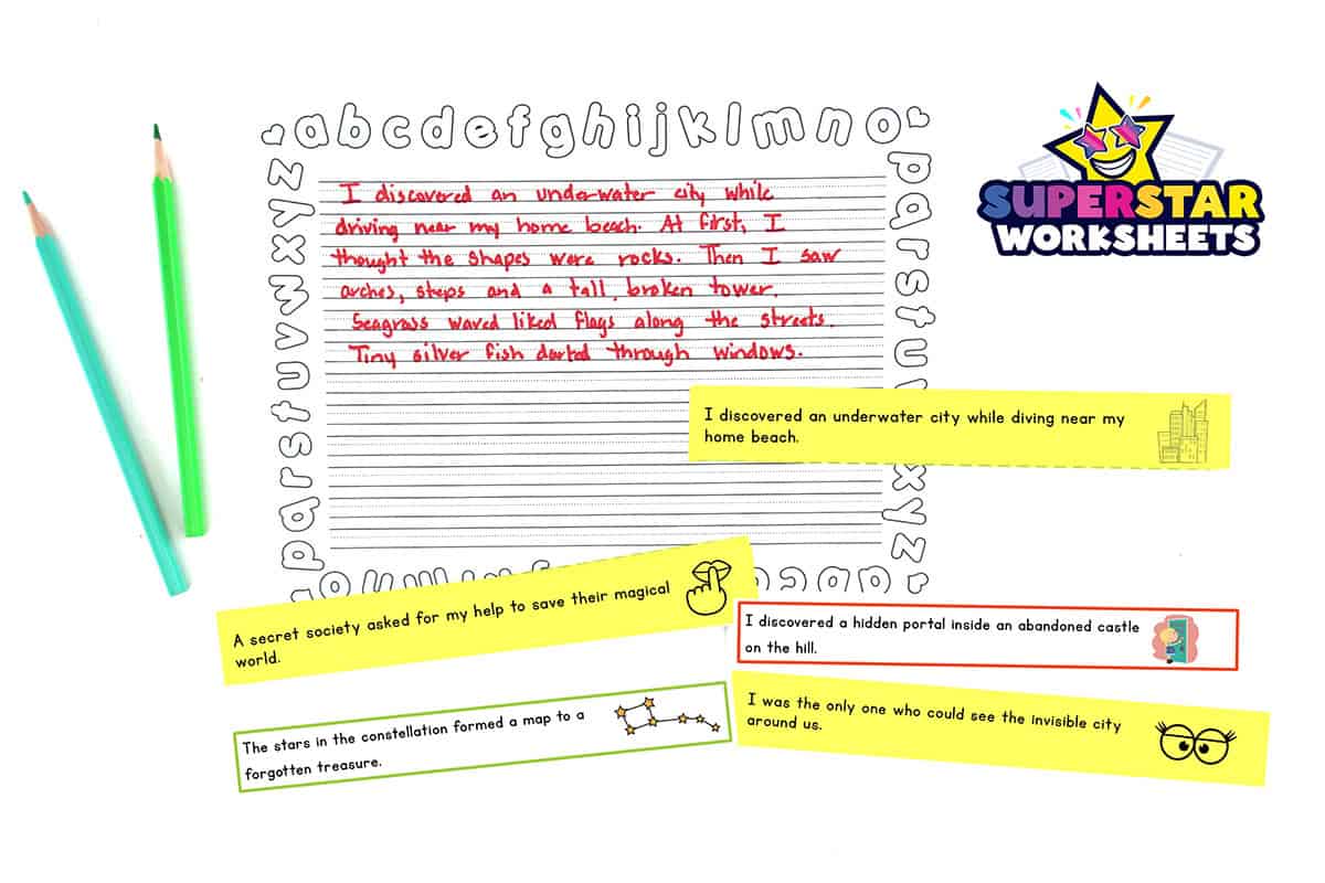 Students pick from exciting story starters featuring adventures like underwater cities and time-bending forests, then use the lines to develop their story starters for kids into full narratives. This story starters for middle school printable gives young writers plenty of space to expand their story starters into complete creative stories!