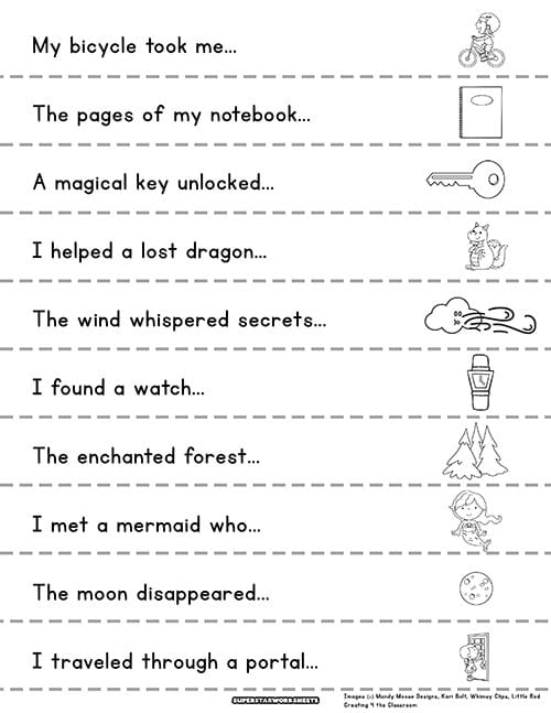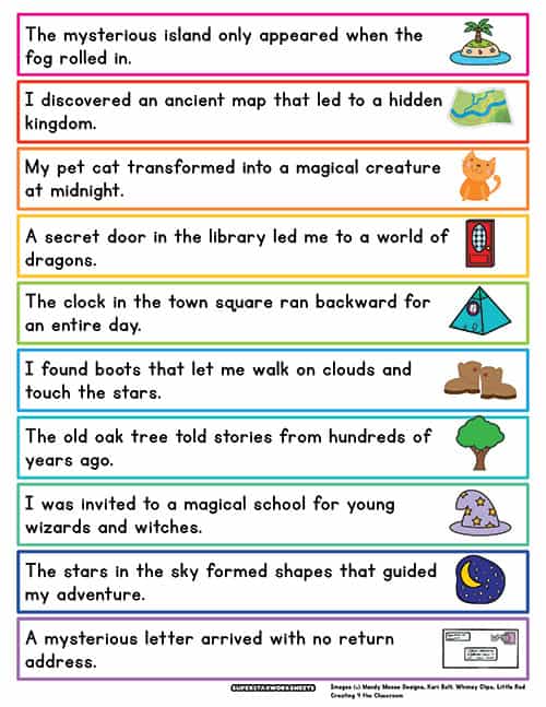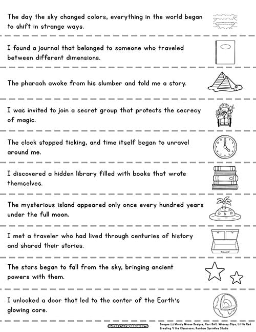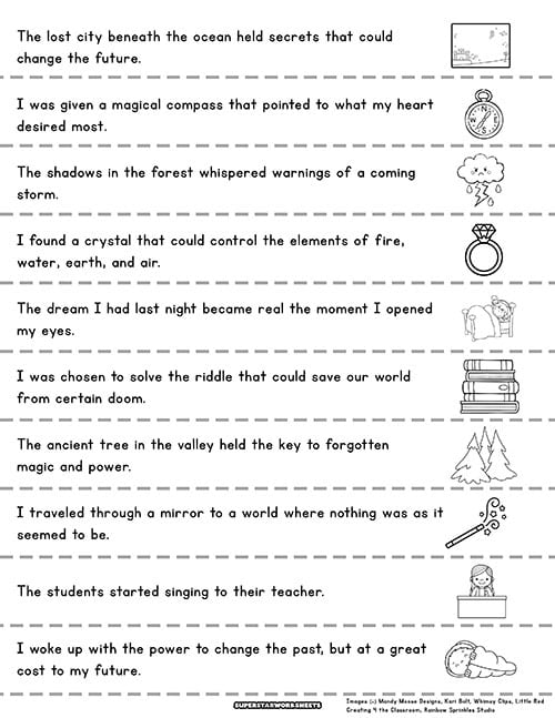 Students cut along the dotted lines to separate these story starters for kids and use them in their notebooks or journals. These fantasy story starters and creative writing story starters help students build narrative writing skills with great sentence starters for stories!