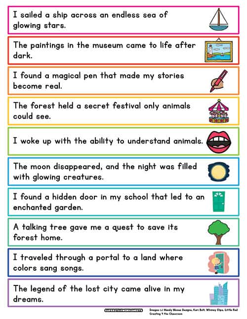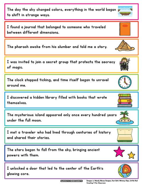 These story starters for middle school feature engaging prompts that capture students’ attention with story starters for kids about time travel, dimensions, and unique adventures. Each story starter strip includes a colorful illustration to spark creativity and help young writers visualize their story starters before they begin writing their narratives.
