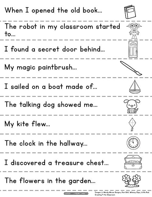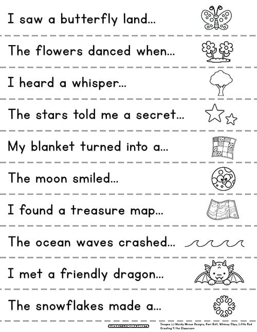 Your young writers will select from these story starters for kids and finish each sentence using the writing lines provided. These creative writing story starters serve as good story starters and sentence starters for stories!