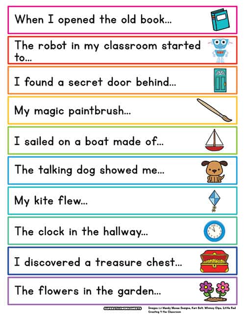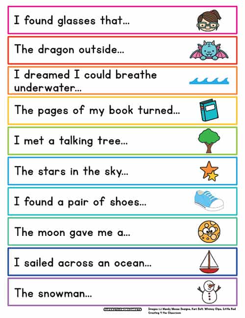 Kids cut out these colorful story starters for kids and glue them into writing journals to finish the sentences. These creative writing story starters are great for helping students get started in their story writing.