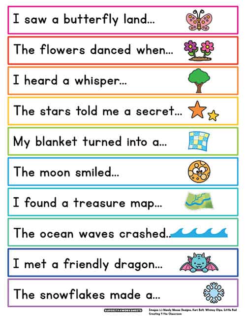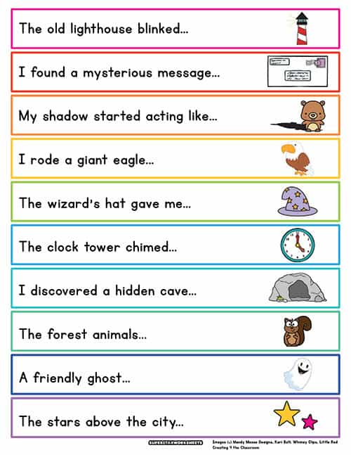 Students cut out these story sentence starters and use them as short story starters or fantasy story starters during writing time. These colorful strips make great story starters and good story starters that story starters for students can pick from, offering creative writing story starters and best story starters for building narratives!