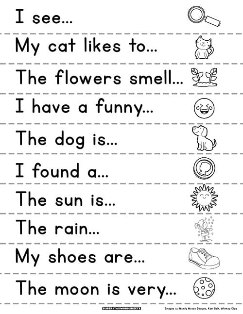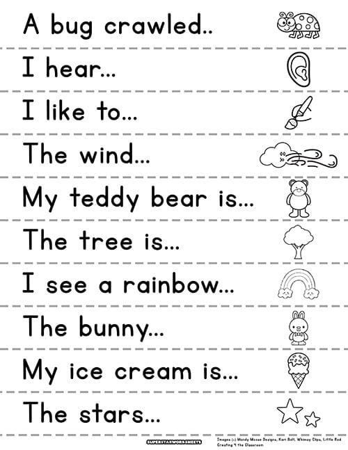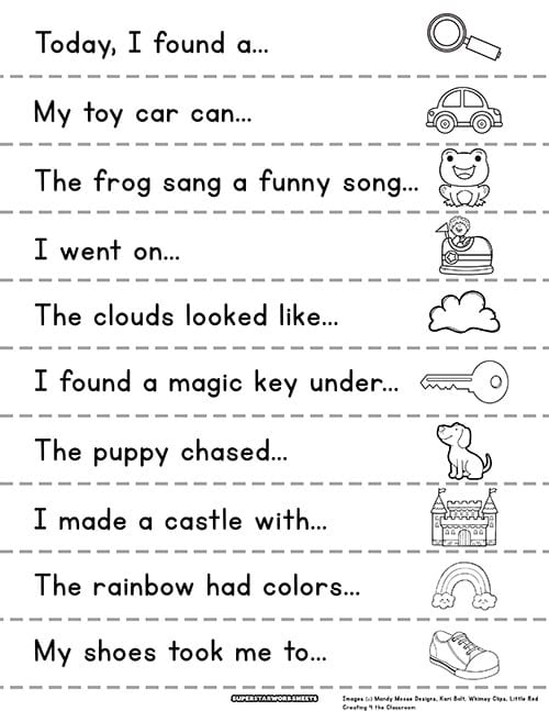 Young writers complete these story starters by finishing each sentence on the writing lines. These simple sentence starters for stories will help kindergarteners practice creative writing with illustrations to guide their ideas!