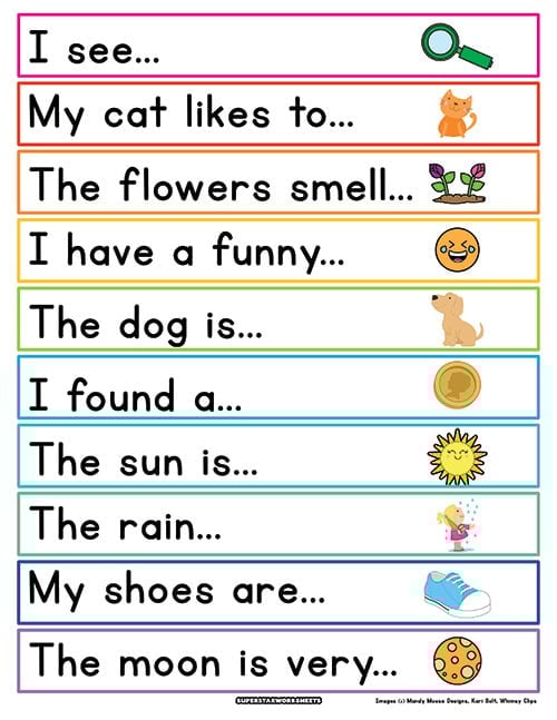 Kids can cut out these colorful story starters and glue them into journals to finish the sentences. These creative writing story starters work as great sentence starters for stories, perfect for kindergarten and early elementary writers!